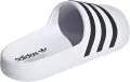 - Σχέδιο: Λιτές λευκές σαγιονάρες διακοσμημένες με τις εμβληματικές τρεις μαύρες ρίγες, που ενσωματώνουν την κλασική αισθητική της adidas.